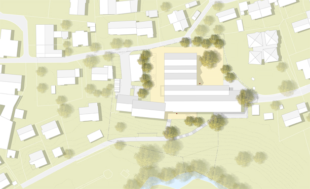 Ziel unserer Konzeption ist die Herstellung eines von außen klar ablesbaren Schulensembles, das zum einen seine Stellung im Ortsgefüge mit Selbstbewußtsein verkörpert und zum anderen mit Rücksicht auf den Maßstab der kleinteiligen Umgebungsbebauung reagiert.